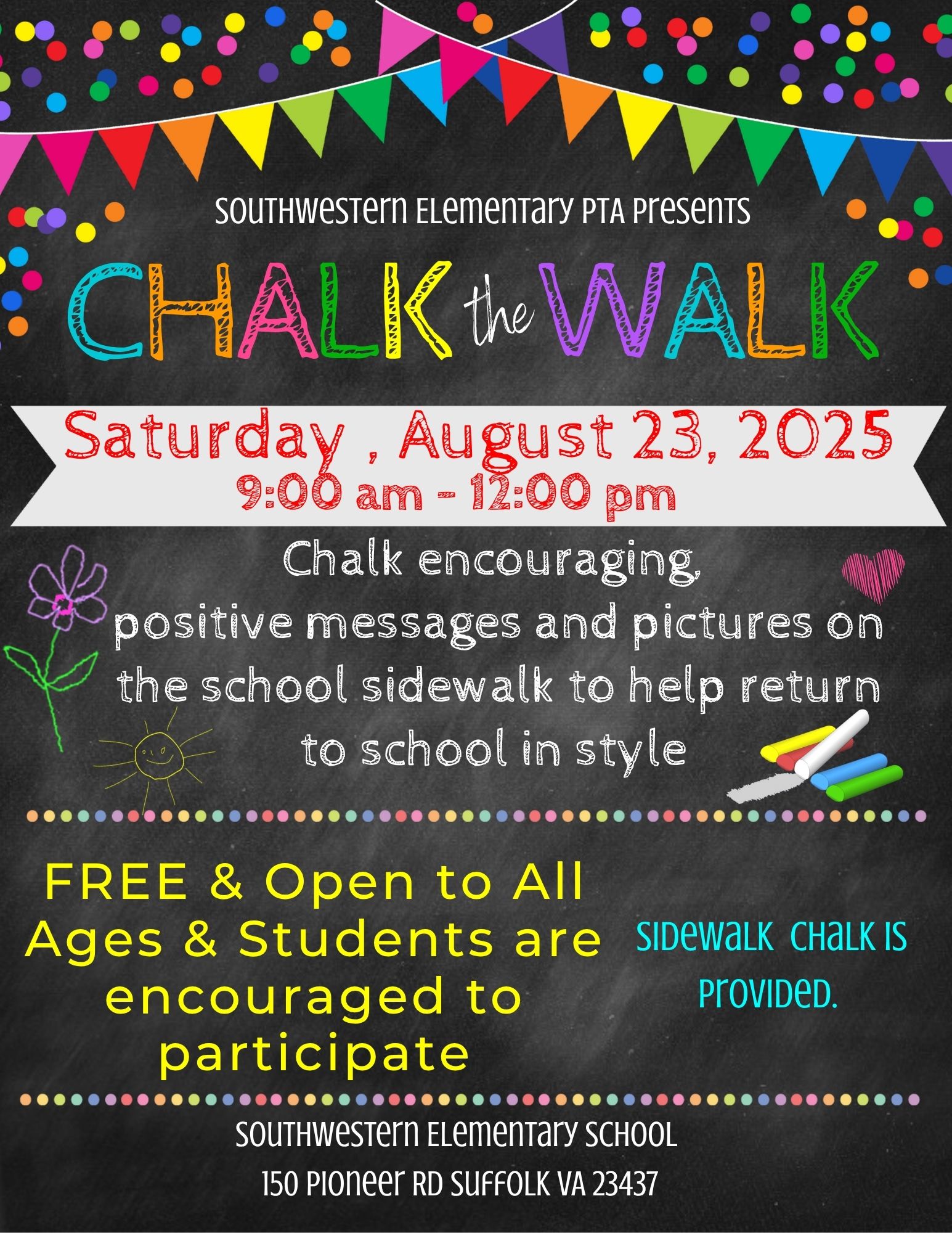 - You are invited to help welcome our Southwestern students back to school in style. This event is FREE and open to the community. Come and decorate a sidewalk square with encouraging, positive messages and pictures using chalk.