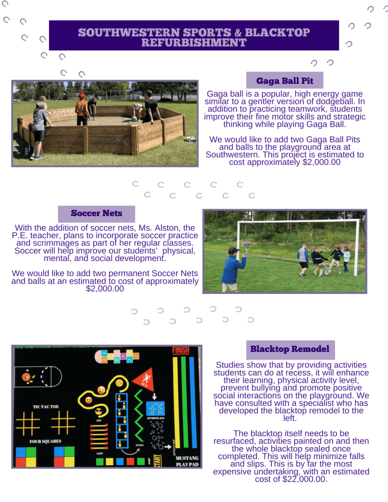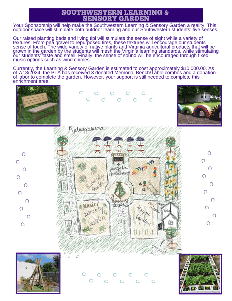 Funds raised from our Sponsorships go directly to Southwestern Elementary to pay for programs that assist students of all economic backgrounds and complement and reinforce what the students are learning in class. For example, last year we used funds to remodel the teacher’s workroom allowing for less time spent using outdated equipment to prep lesson materials and more time in the classroom with engaging materials. We recently purchased two portable basketball hoops for student use during recess and gym. Funds are also used to stock the Teacher Store which provides free monthly school supplies to all Southwestern teachers. Our PTA pays for educational, cultural, physical and social programs that are not currently paid for by Suffolk Public Schools district or the State of Virginia. Please consider sponsoring us below so we can continue improving our Southwestern community together.